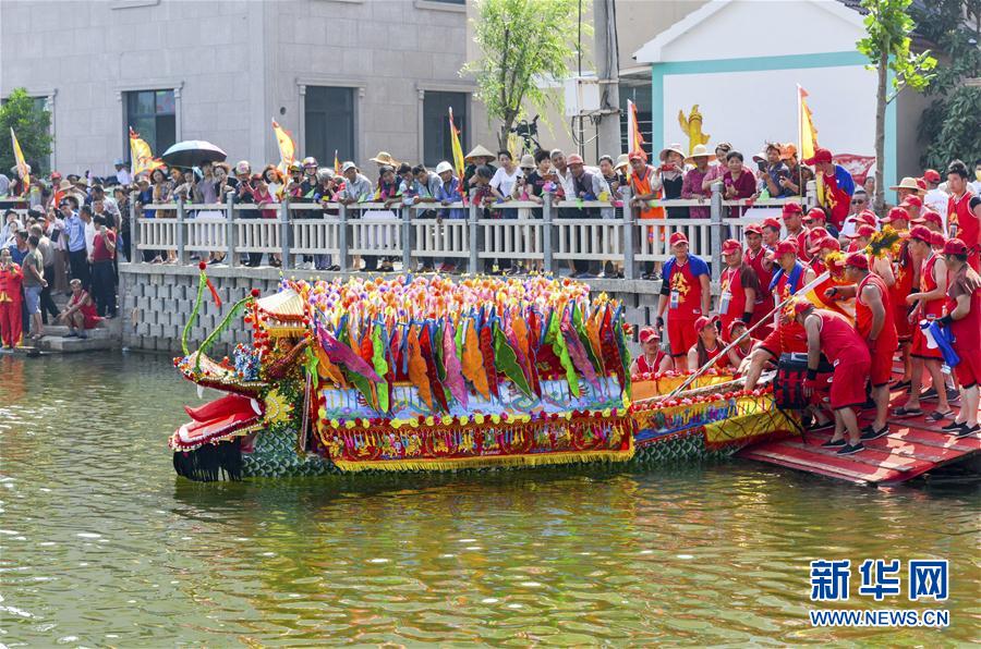 6月3日,在浙江省湖州市長興縣倪家田村,一艘花龍舟准備下水。 端午將至,人們參加多彩民俗活動迎接傳統節日的到來。