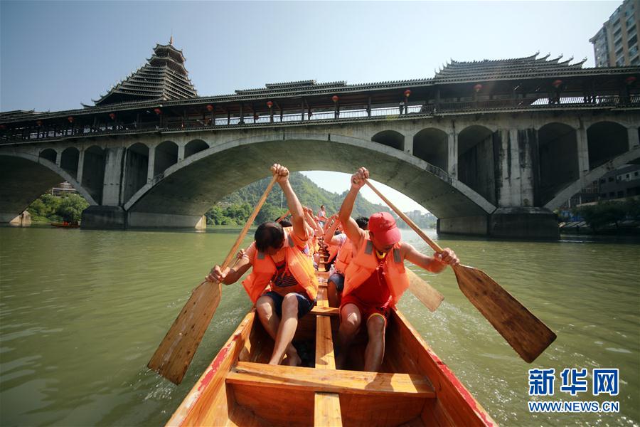 6月3日,在貴州省銅仁市玉屏侗族自治縣舞陽河上,龍舟隊進行訓練。 端午將至,人們參加多彩民俗活動迎接傳統節日的到來。