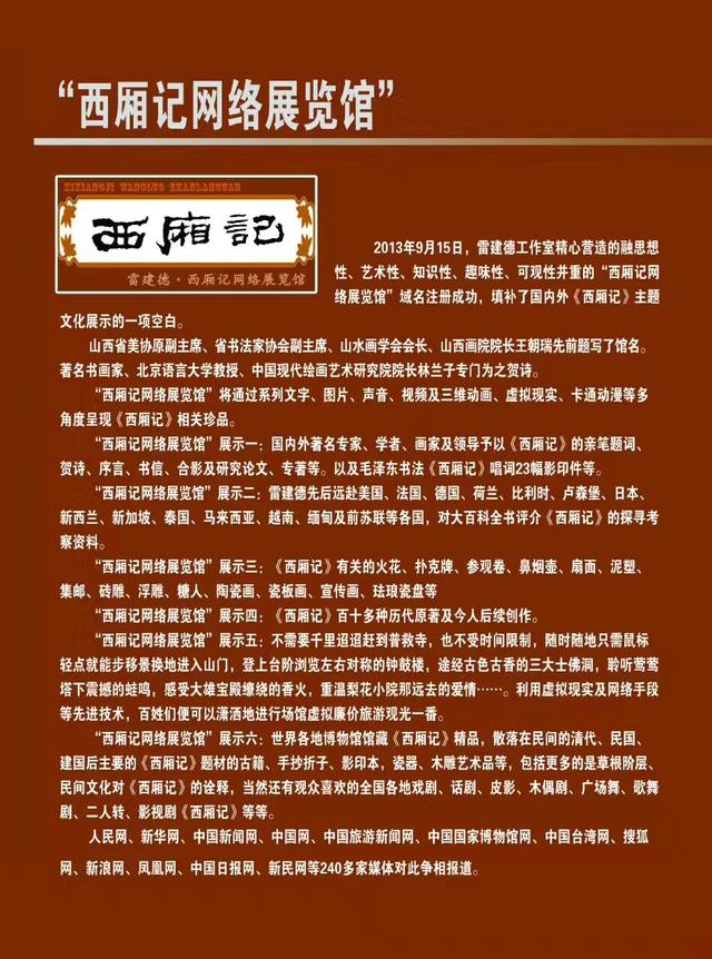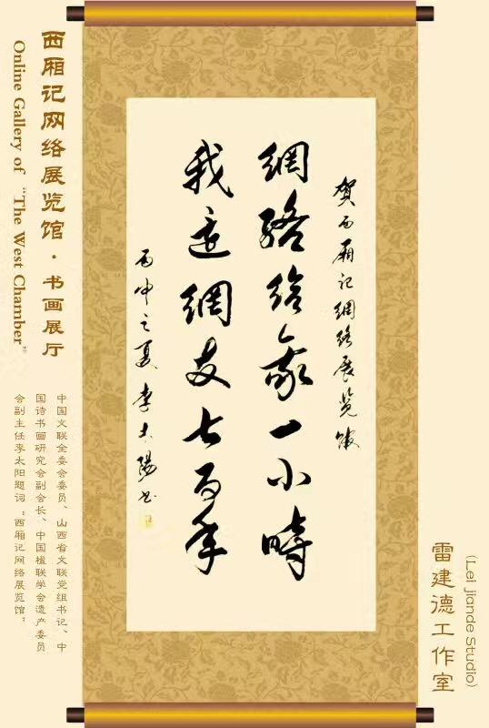 2013年秋,雷建德順應時代發展,採用“互聯網+”的方式,帶領團隊創建“西廂記網絡展覽館”,通過系列文字、圖片、聲音、視頻及三維動畫、虛擬現實、卡通動漫等,多角度呈現《西廂記》相關珍品9000多件,推動古典名著《西廂記》文化的數字化進程,進而促進《西廂記》優秀資源共享,使西廂文化傳播集思想性、藝術性、知識性、趣味性、可觀性、互動性於一體,被譽為“網絡給我一小時,我還網友七百年”!