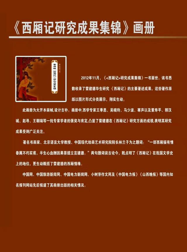 對西廂文化這一美的向往、美的追求、美的創作、美的傳播,並始終貫穿和影響其一生的雷建德而言,西廂文化並不是短暫的燭光,而是一支輝煌的火炬,他不僅現在舉著它,而且要在傳給后人之前,讓它盡可能燃燒得更明亮些!
