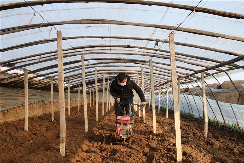 廣府鎮后當頭村的村民正在大棚裡旋耕土地。