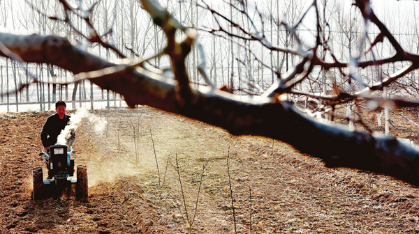2月25日,垣曲縣王茅鎮上亳村農民張永紅駕駛手扶拖拉機整地,准備春播。