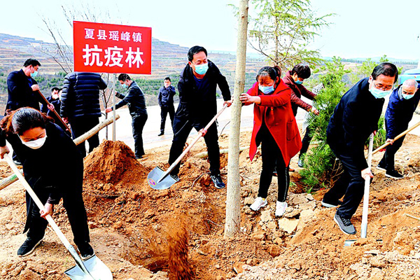 眼下,正是植樹造林黃金季節,為了做到防疫植樹兩不誤,3月15日,夏縣瑤峰鎮調動機械挖坑,組織黨員干部栽植紫葉裡、百皮鬆、法國桐800多株。為紀念這個特殊春天,萬眾一心,眾志成城,抗擊疫情的階段性勝利,特命名為“抗疫林”。圖為該鎮機關黨員干部正在栽植“抗疫林”。