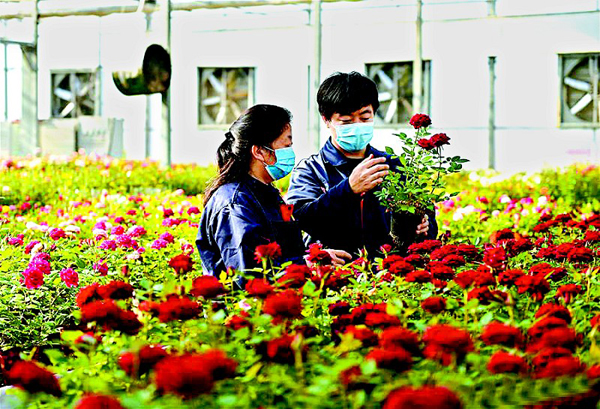近日,花卉市場需求大增,山西省太原市的花農們在做好疫情防控的基礎上,加緊生產,保障供應。圖為日前太原市晉源區花卉小鎮振華園藝花卉產業園,工作人員正在優選盆栽玫瑰。
