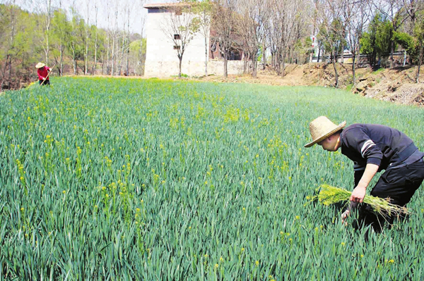 4月17日,陽城縣町店鎮農民正在麥田去除雜草。當前,小麥正處在拔節、抽穗期,村民抓緊對麥田進行澆水、治虫、除草,促進小麥豐產豐收。