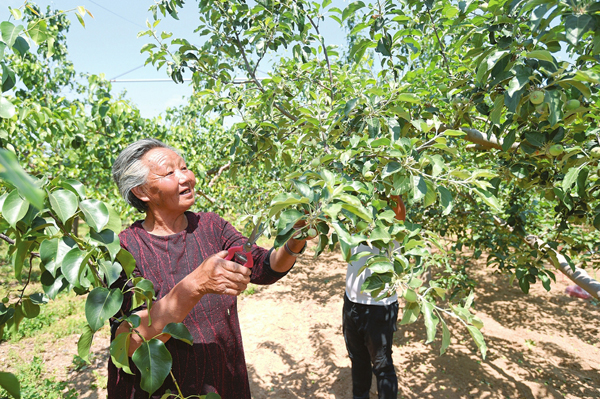 5月29日,隰縣陽頭升鄉竹干村玉露香梨園內,果農正為梨樹進行套袋管理。近年來,隰縣把玉露香梨作為群眾脫貧致富的支柱產業,形成了“一街一碼一品牌一體系”的特有模式,探索出一條產業富民之路。