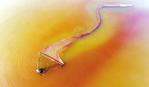 6月5日,運城鹽湖中,工人正在捕撈鹽虫。進入夏季,鹽湖生物養殖基地的鹽虫大量繁殖,增長速度較快,鹽湖周邊村300余名村民成為專業捕虫人,平均每人每天下水捕撈4個小時,年收入3萬余元。