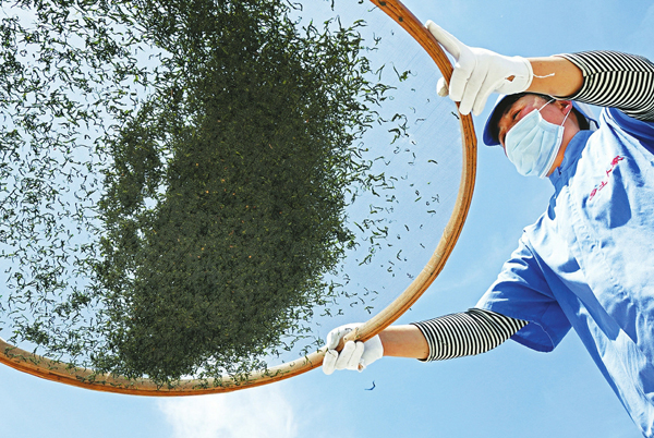 6月15日,在陵川縣鄉土人家農業綜合開發有限公司的制茶車間,工人正在加工收購回來的新鮮連翹葉。目前,陵川縣連翹野生撫育種植面積達28萬畝,實現採集收入1.85億元,連翹產業覆蓋全縣70%的村,採取“公司+合作社+基地+農戶”的發展模式帶動1.5萬戶農民實現了穩定脫貧。