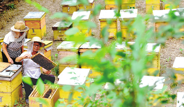 7月14日,在垣曲縣歷山鎮薛家堡村的田野裡,來自芮城縣的一家養蜂戶正在觀察產蜜情況。每年5月份起,垣曲漫山遍野的荊條陸續開花,一批四川、陝西及我省各地的養蜂人便會追花奪蜜來到這裡安營扎寨,在3個月的花期內產出荊花蜜,鼓起了“錢袋子”。