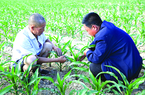 圖為辛生德(圖右)與村民探討地膜玉米種植。 記者 臧媛慧 攝