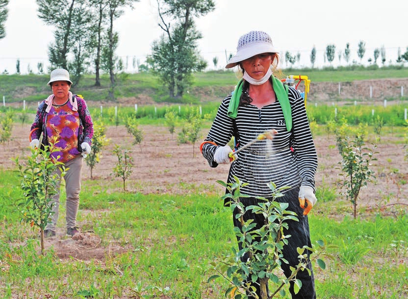 新榮區郭家窯鄉蘆家窯村調整產業結構,利用“兩溝一灣”小氣候發展林果經濟,2019年、2020年先后投資240萬元種植檳果、李子等經濟林270畝11000多株,挂果后每畝純收入可達2萬元。圖為8月3日,村民在該村檳果園給果樹噴洒營養液。