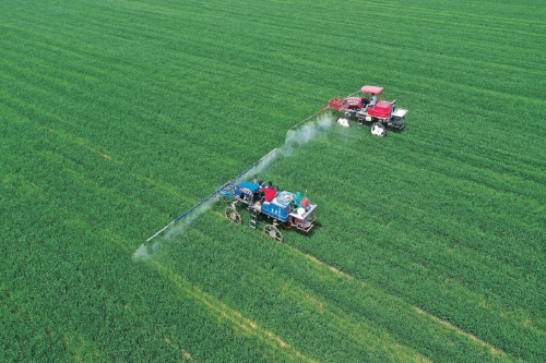 圖為安徽省蒙城縣楚樓村農民利用輪式噴杆噴霧植保機為小麥噴洒防治蚜虫和鏽病的農藥。 胡衛國 攝