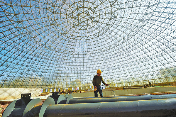 11月4日,陽曲縣萬向農業園內,施工人員正加緊建設智能穹頂溫室。該溫室全部採用鈦金玻璃打造,目前穹頂外形已經完成建設,進入內部建設階段。溫室建設完成后,將成為國內高端先進的觀光農業溫室,為該農業園提供一座新品種展示智能示范基地。