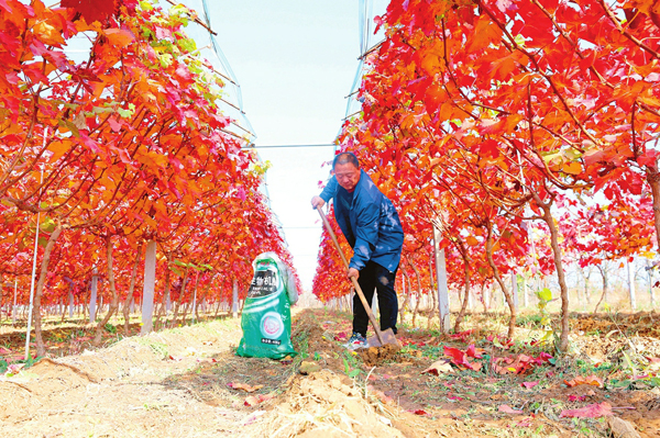 11月19日,夏縣裴介鎮魯因村村民周滿師正在葡萄園忙著追施底肥。周滿師承包5畝地種植無公害葡萄,以每公斤30元的價格銷售到太原、內蒙古等地,經濟效益十分可觀。