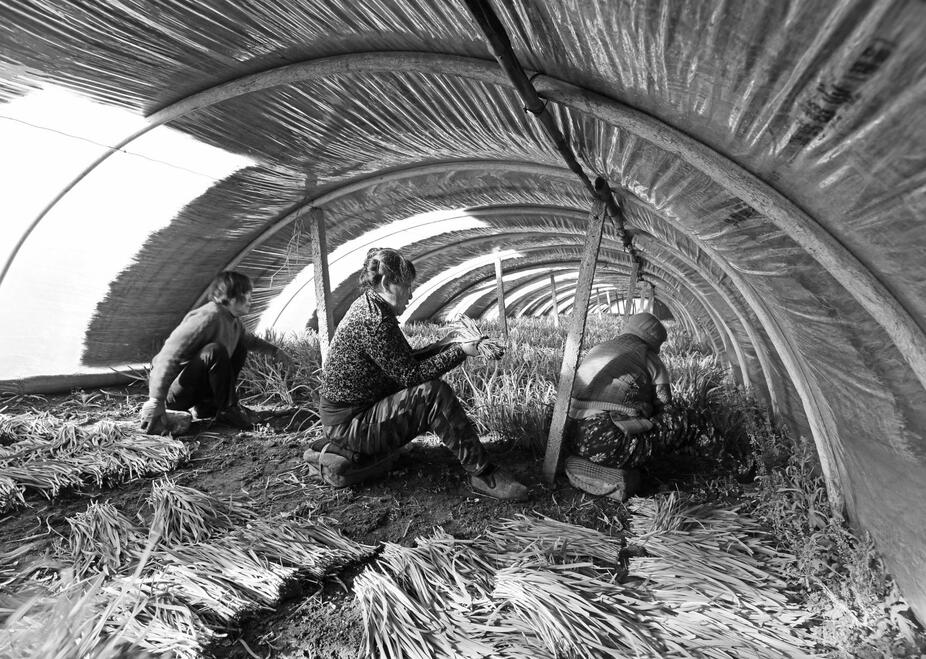 2月7日,灤南縣宋道口鎮斷火庄村農民在拱棚裡收獲韭菜。