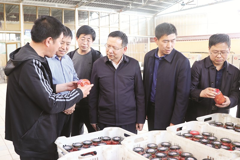 縣委副書記、政府縣長栗俊昌(右三)在響水河鎮敦曹村調研西紅柿深加工項目