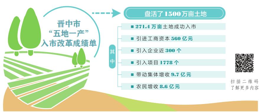 隨著“五地一產”入市改革的深入推進,8個月來,晉中市盤活了1500萬畝土地,其中271.4萬畝土地成功入市,引進工商資本560億元,引入企業近300個,引入項目1778個,帶動集體增收9.7億元,農民增收8.6億元。轉瞬間,晉中農村的土地變成了一隻“潛力股”。