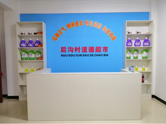 “我們設立‘道德超市’,村民以積分換取日常生活物品,積分的獲取主要是由村小組評議組對每個家庭在‘遵紀守法行為文明、熱心公益支持發展、誠實守信勤勞致富、家庭和睦鄰裡團結(移風易俗、破除陋習、婚事新辦、喪事簡辦、孝敬父母、志願服務)等方面進行評分,根據評分到超市兌現生活用品。” 后溝村黨總支書記任喜忠介紹。