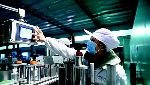 近日,重慶市彭水縣在做好新冠肺炎疫情防控的同時,積極組織扶貧企業、扶貧車間有序復工復產,幫助當地群眾就業增收。圖為日前,在位於彭水縣的扶貧企業重慶康百礦泉水有限公司車間內,工人在生產線上忙碌。