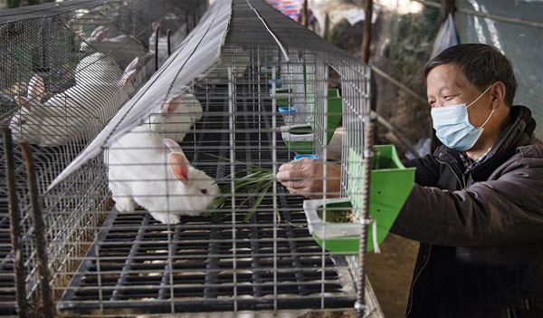 地處秦嶺南麓的陝西省漢中市洋縣槐樹關鎮北梁村曾是遠近有名的貧困村。近年來,當地堅持因地制宜、長短結合的產業發展思路,發展成本低、見效快、風險小、效益明顯的肉兔養殖產業,促民增收,2019年實現了整村脫貧。村民趙桃生也通過養兔而實現了脫貧致富。圖為日前,趙桃生正在自家兔舍裡喂兔。