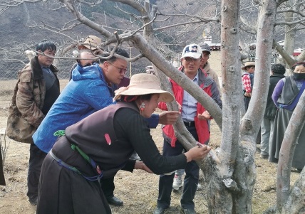 國家蘋果產業技術體系川西高原綜合試驗站謝紅江研究員(左二)在指導阿壩州蘋果病虫害防治。 資料圖