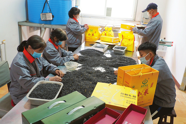 6月2日,陽曲縣泥屯鎮一合作社內,村民在包裝加工生產出的小雜糧。這個合作社完成土地流轉並自種自收1916畝,種植谷子、苦蕎、紅芸豆、黑豆等作物,發展小雜糧產業,從播種到收割,從加工到送貨,吸收村民就業。目前,已帶動13戶25個貧困人口穩定脫貧,受益貧困戶600余戶1500余人。