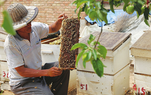 6月12日,夏縣瑤峰鎮李家坪村農民朱仲獅正在查看蜜蜂採蜜情況。朱仲獅是建檔立卡貧困戶,依靠扶貧好政策養蜂34箱,種黃芩、柴胡藥材10余畝。如今,他一年收入七八萬元,摘掉了貧困帽,走上致富路。