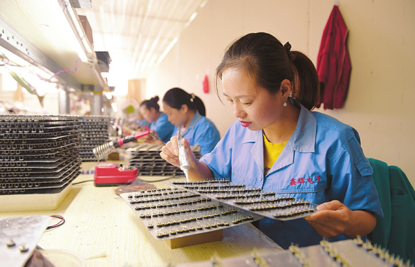 大寧縣昕水鎮小馮村輕工業園區大寧縣鑫輝電子元件制造有限公司採取“生產線下鄉扶貧”模式,分別在大寧縣徐家垛鄉南桑峨村、三多鄉劉家庄村以及曲峨鎮曲峨村建成並投產了三條扶貧生產線,提供就業崗位800個,農民可在家門口實現就業。圖為9月20日,公司生產車間內,工人們正在加緊生產。