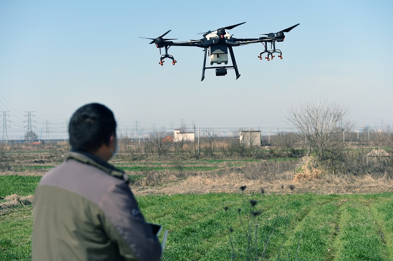 2月18日,在安徽省肥東縣長臨河鎮,農民操作植保無人機進行噴洒作業。