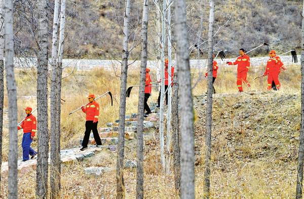 4月13日,在大同市靈丘縣獨峪鄉曲回寺村,護林員們正在林間巡查。靈丘縣各鄉鎮黨員干部加強護林宣傳,提高村民防火意識,在林區、景區、山谷口等地設卡,嚴防外來火患。