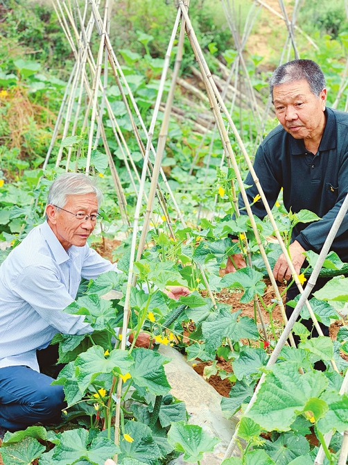 8月2日,鄭中午(左)和他的老伙伴常珠煥正在察看有機蔬菜的物理除虫情況。梁建法攝