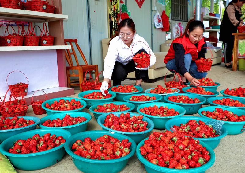 近期,為幫助因草莓集中上市和訂單增多造成用工緊缺的草莓種植戶,浙江省長興縣畫溪街道組織巾幗志願者等服務隊伍到草莓種植基地幫助低收入農戶採摘、分揀、裝籃和送貨,助農增收。圖為巾幗志願者在該縣畫溪街道草莓產業幫扶示范基地內與農戶一起分揀、裝籃成熟草莓。