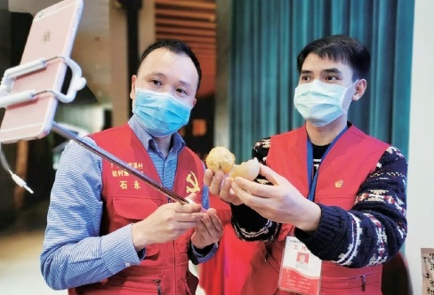 藍毅(右)在京東直播基地向網友介紹特色農產品。 資料圖