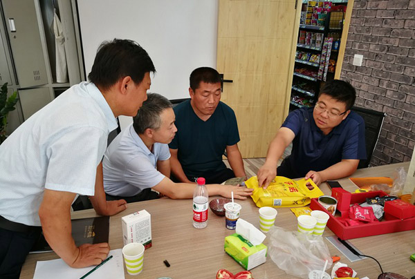馮毅(右)與干部們共同商議小米包裝樣式