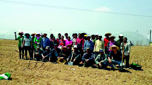 孫英浩(前排右一)和村民在陽光大棚園區共同勞動