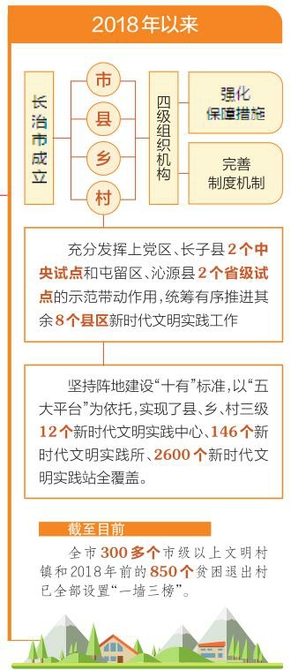 2018年以來,長治市深入推進新時代文明實踐工作,完善組織架構,明確市級指導、縣級統籌、鄉村兩級落實的工作模式,在市縣鄉村四級設置組織機構,強化保障措施,完善制度機制,充分發揮上黨區、長子縣2個中央試點和屯留區、沁源縣2個省級試點的示范帶動作用,統籌有序推進其余8個縣區新時代文明實踐工作。堅持陣地建設“十有”標准,以“五大平台”為依托,實現了縣、鄉、村三級12個新時代文明實踐中心、146個新時代文明實踐所、2600個新時代文明實踐站全覆蓋。