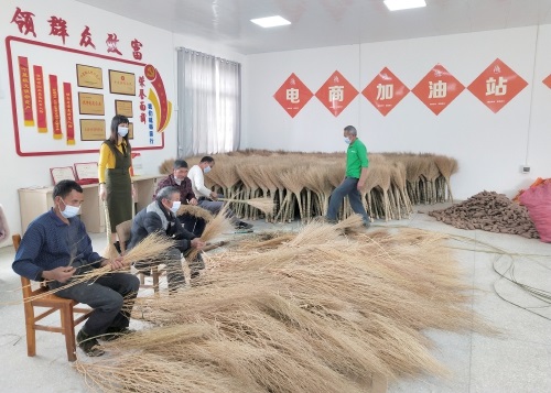日前,湖南省江永縣瀟浦鎮和興村貧困戶領到今年春節后的第一筆“工資”。和興村是一個省級貧困村,在疫情防控期間,村裡“電商姐”葛小梅引導村民不出門、不串戶,安心“宅”家扎掃帚。目前,村裡“掃帚扶貧車間”已經復工復產。圖為貧困戶在扶貧車間制作掃帚。