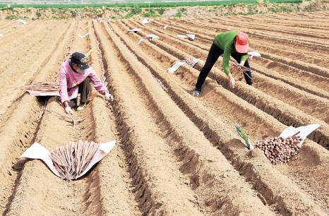 3月26日,河南孟州市西虢鎮韓庄村農民正在利用機械開溝種植懷山藥。孟州是山藥、牛膝、地黃、菊花“四大懷藥”主產地。近年來,該市把發展“四大懷藥”種植作為農業支柱產業,積極扶持引導農民不斷擴大懷藥種植面積,2019年全市種植面積達到2000公頃,預計總產量4000萬公斤,總產值達2億元。