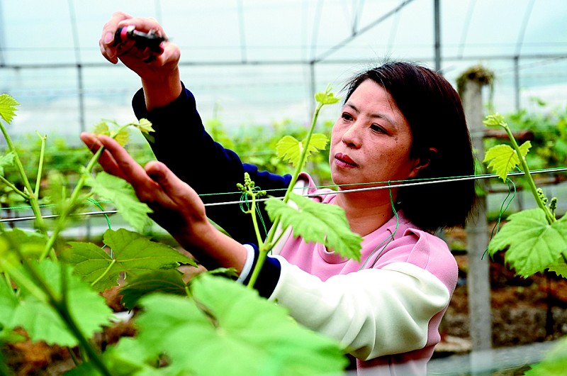 圖為4月11日,毛富枝在政和縣星溪鄉東峰大棚陽光玫瑰葡萄種植標准化示范基地修剪葡萄枝條。