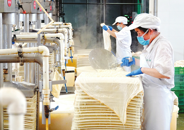 6月8日,在長治市胖妞食品有限公司豆制品生產車間,工人們正在各個崗位上緊張有序忙碌著。一直以來,該公司堅持以科學、安全、健康為理念,在科技研發、生產加工、市場營銷等領域不斷壯大企業發展路徑。在法國投資建設的胖妞食品有限公司已順利投產,各類豆制品迅速打開歐洲市場,受到當地百姓的青睞。