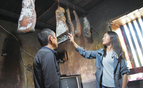 劉迪敏(右)在村民李正玉家中收購臘肉。
