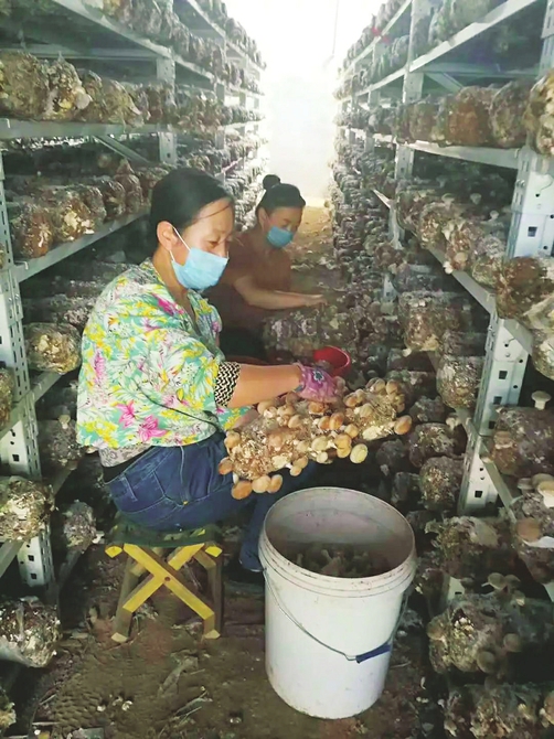食用菌養殖大棚裡一派繁忙景象,工人們忙著採摘香菇,裝筐,按下單信息發貨。
