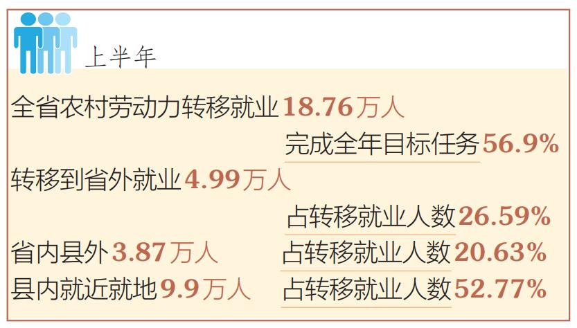 穩定農民工就業是穩住就業的基本盤。今年,我省發布《關於統籌推進疫情防控和穩就業工作的通知》等政策措施,多措並舉引導農民工安全有序轉移就業。數據顯示,上半年,全省農村勞動力轉移就業18.76萬人,完成全年目標任務56.9%。