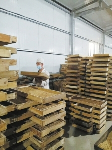 2019年,海發生物公司了解到李冬新的情況,將他特招入養殖車間。“活兒不難,也不重,就是鋪好麥麩,喂養黃粉虫幼虫,一個月給開 1800塊錢兒,特別感謝公司給了我這個營生。”在海發生物科技公司養殖車間,李冬新穿著白大褂,戴著帽子口罩,站在層層堆放著的一個個養殖盤中間,正在鋪放麥麩、噴水,麥麩中藏著黃粉幼虫。“黃粉虫長大了,經過微波處理,能出口到國外,我現在養的這些都是要出口的。”