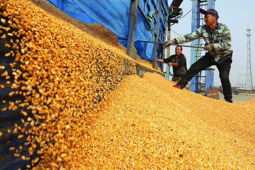10月27日,在寧安市合眾糧食貿易有限公司,農民裝卸玉米粒。