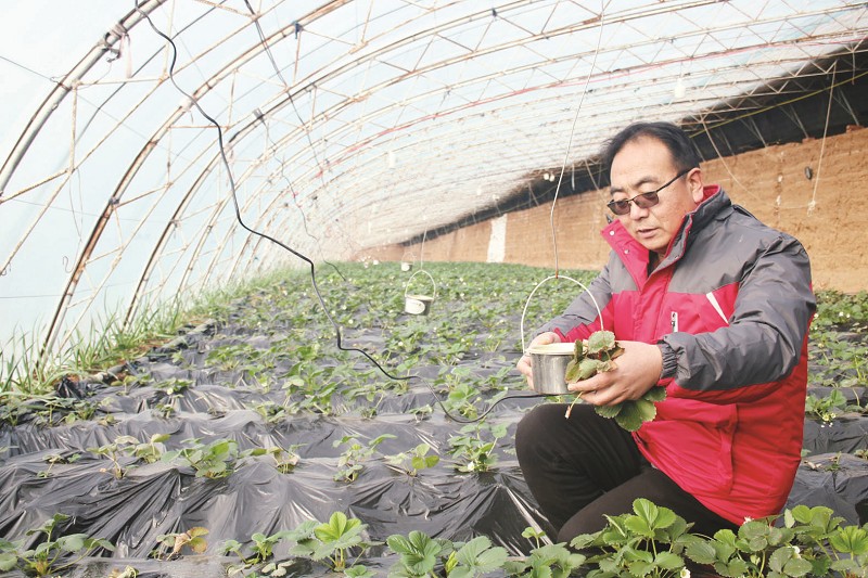 近年來,陽城縣加大力度扶持設施農業發展,現已發展設施種植、設施養殖和設施食用菌基地千畝以上,安排農村剩余勞力萬余人。設施農業已成為陽城農民增收、農業增效的新亮點。圖為11月29日,該縣西河鄉孫溝村優質草莓基地,管理人員正在查看草莓的生長情況。
