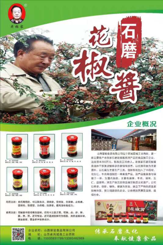老張家石磨花椒醬按照科學的配比、處理、研磨,根據不同地域和不同人群不同的用法,加入了牛肉、花生、芝麻、杏仁、豆豉,做成了牛肉花椒醬、麻辣花椒醬、調味花椒醬、伍仁花椒醬、花椒芽醬、豆豉花椒醬,干花椒粒,花椒粉等系列產品。 紅酥油亮、麻中透香、 麻酥酥、香滋滋,鹵肉、拌陷、炒菜、調味、拌面、下飯、就饅頭,一勺就能讓平常的飯菜變得令人食欲大增、唇麻齒香、回味無窮,集美食與保健為一體。