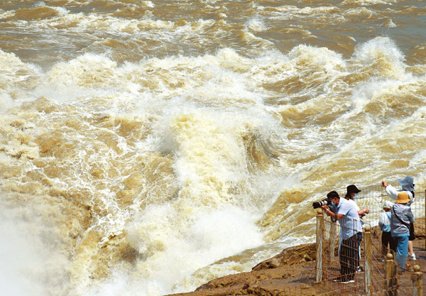 6月10日,游客在吉縣黃河壺口瀑布景區游覽觀瀑。近日,受上游水庫調節放水影響,黃河晉陝峽谷水量增大,壺口瀑布再現百米壯美瀑布群景觀,吸引了眾多游客。