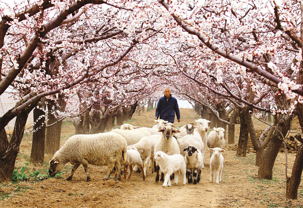 三月八日,平陸縣常樂鎮薛家村農民正在杏花林裡放羊。此時牛、羊等野外放養正當時,當地農民在做好防疫、春耕的同時,紛紛將自家的牛、羊實施野外放養管護。