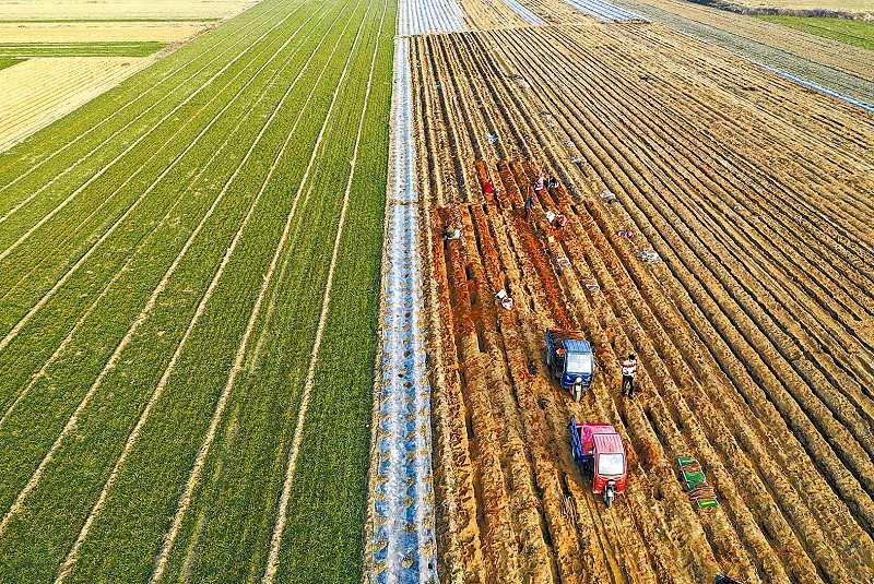 2月4日是農歷二十四節氣“立春”,在“晉南糧倉”運城市,已是春暖花開,春意盎然。農民們一手抓疫情防控,一手抓田間管理,田間地頭處處是人勤春早的農忙景象。圖為新絳縣龍興鎮橋東村村民在田間抓緊收獲豐收的山藥。